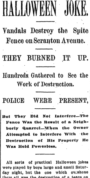As the clock neared midnight on Halloween in 1897, a band of boys armed with hatchets and axes descended on the intersection of Scranton and Clark Avenue. In the spirit of the holiday, the weapon-toting youths began their vicious attack on the neighborhood's most peculiar structure--a 23 foot-high fence. The eyesore had been constructed three weeks prior as part of a dispute between neighbors D. Z. Herr and M. Moon. Following Moon's raising of a barn, Herr stacked boards to build the absurdly tall wall in an effort to block the view. Herr, convinced that his neighbor was attempting to strong-arm him into purchasing his property, refused to remove the barrier until the barn was removed. Moon declared that the fence did not bother him. As the vandals chopped away at the "spite fence," Herr emerged from his home and tried to intervene. Quickly restrained by the hoodlums, Herr watched as the structure was torn down and transported to a nearby vacant lot. The noise generated by the disturbance had attracted a crowd of hundreds from surrounding blocks, who idly looked on as the boards were doused with coal oil and set on fire. By the time the police arrived, the neighborhood had joined the boys in singing and dancing wildly around the flames. The police sat by and watched, but strangely were unable to identify any of the boys despite their best efforts. No arrests were made. When the fire finally died down, a sign was erected on the site: "Here lies the remains of the fence that Herr built."