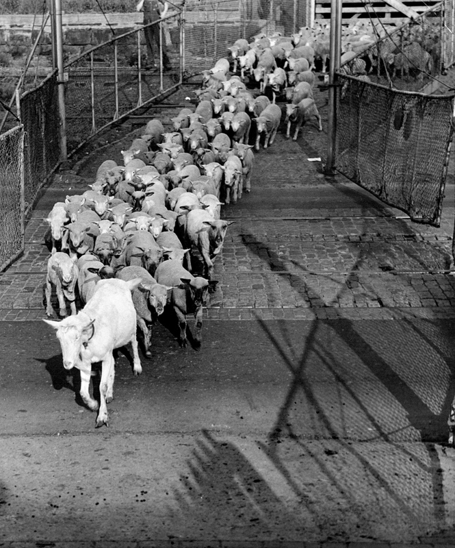 For the first two-thirds of the twentieth century, it wasn't unusual for motorists like these to encounter herds of cattle, flocks of sheep, or a drove of hogs, all on their way from the Cleveland Union Stockyards to nearby slaughterhouses-- sometimes more elegantly referred to as "abbatoirs." On a daily basis, buyers from Swift & Company, Ohio Provision, Theurer-Norton, Webb Beef, Gibbs, Inc., and the other meat packers and renderers whose buildings stretched around the Stockyards like a giant inverted "C," would come to the yards. There they dickered with commission agents of the farmers who had raised the cattle, sheep and hogs in Ohio, Michigan and elsewhere and had then transported them by rail to Cleveland's Union Stockyards for sale. Buyer and seller squabbled over quantity and price per pound. And, when a buyer was finally sure that he hadn't been given a "bum steer," a deal would be struck. All that remained then was to transport the animals purchased to the meat packer's slaughterhouses. Given their geographical proximity to the Stockyards, the easiest way to accomplish that was to simply walk the animals there.