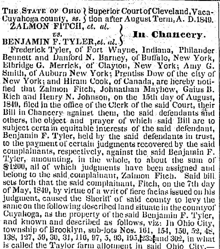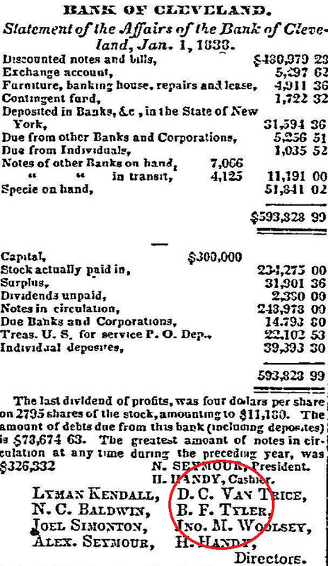 Benjamin F. Tyler was born in Jefferson County, New York, in 1802. He came to Cleveland in 1832 as the principal representative of an investment group from Buffalo, which included New York state judge Philander Bennett, his wife Sarah's uncle. The out-of-state group had entered into an agreement with two Cleveland merchants, Charles M. Giddings and Norman C. Baldwin, to purchase and redevelop Lorenzo Carter's 80-acre farm on the west bank of the Cuyahoga River in what was then Brooklyn Township. At the time, the Ohio and Erie Canal was nearing completion and people everywhere were flush with land speculation fever.