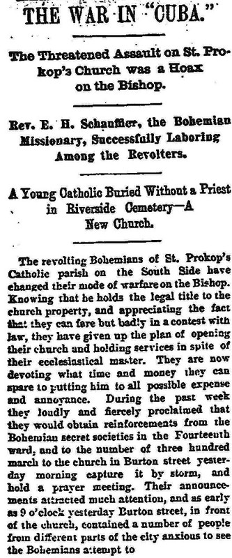 Also contributing to this view of the neighborhood in this period were reports by the local newspapers, especially the Cleveland Leader, of the long running battle between church officials and the lay parishioners of St. Procop Roman Catholic Church on Burton (West 41st) Street, on the eastern edge of the Isle of Cuba. The Leader characterized this battle, which lasted from the mid-1870s until the late 1880s, as one between a dictatorial Slavish church and an open-minded lay population. It called upon Cleveland's Protestant ministers to conduct "missionary work" among the west side Bohemians. From time to time thereafter, the paper commented on the spiritual progress that these ministers were making in that community.
