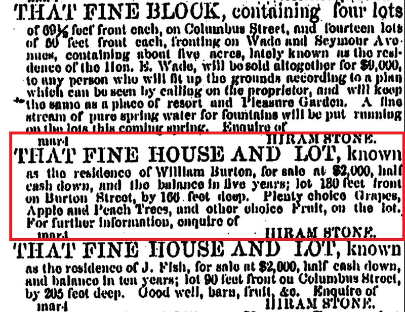 Change came to the house in 1854 when Burton sold most of his thirty acres of land to Hiram Stone, a local land developer. Stone incorporated the house into a large residential subdivision that he was building and named the county road upon which the house sat "Burton Street" for William Burton. Stone's subdivision would soon become the newest addition to Cleveland's south side.
