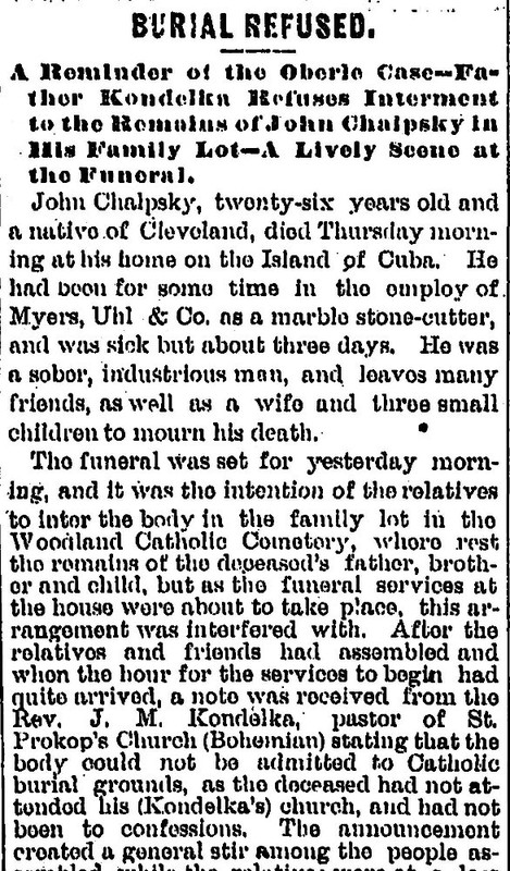 They were probably hoping for a better result. The Czech parishioners, that is. Especially those who were old enough to remember what had happened three decades earlier. Back in 1874, after they had completed construction of their first church, that small white wooden structure on Burton Avenue (West 41st Street) on the same grounds as this new church. First there was the incident in 1878 when the pastor, Father Koudelka, had refused to permit the burial in consecrated grounds of a young man, who had not attended mass or gone to confession regularly enough. And then there was the pastor's arrest the following year for libel and his hurried departure thereafter from the parish. Followed by the all too short stay of the kindly Father Antl. And then the acrimonious dispute with Bishop Gilmore in 1884 over the election of a new parish council. Even Father Furdek, the father of American Slavs, couldn't resolve that dispute. That was the year the Bishop closed the church, sparking violent confrontations between parishioners, church officials and local police officers, which continued on and off for much of the rest of the decade.