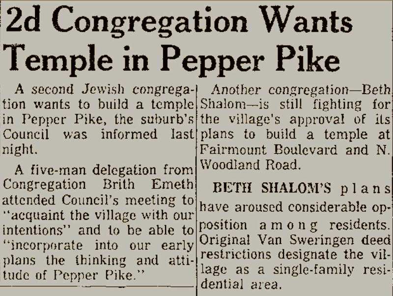 Ratner's current facility began as the Brith Emeth Temple. From its inception in 1959, the Brith Emeth Congregation had met in the First Unitarian Church in Shaker Heights. Under Rabbi Philip Horowitz's guidance, Brith Emeth grew to nearly 400 families in its first few years, making it the tenth largest Reform congregation in Ohio. Brith Emeth acquired land for its own temple in Pepper Pike in 1962. In doing so, it overcame the legacy of exclusion embodied in the Van Sweringen Company deed restrictions since 1926, when the railroad barons' Shaker Heights venture grew to include Shaker Country Estates, a vast, wooded expanse earmarked for large home sites. Later absorbed by Beachwood, Pepper Pike, Orange, Hunting Valley, and Gates Mills, the properties continued to carry their original Van Sweringen restrictive covenants. Brith Emeth's success in building on former Van Sweringen land contrasted with a fight that pitted another Jewish congregation against a hastily formed Pepper Pike Homeowners Association that purportedly opposed the temple on grounds of endangering the community's residential character.