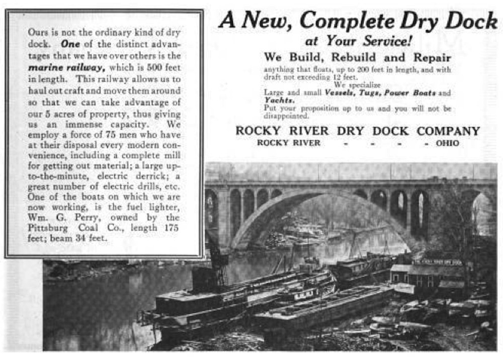 This revival of America's wooden shipbuilding industry during the Great War presented the Rocky River Dry Dock Co. with new opportunities for growth. Incorporated in 1914 by Theodore R. Zickes, the boatyard specialized in the repair and construction of yachts, dredges and scows prior to the war. Located an eighth of a mile from the mouth of the Rocky River, across the banks from what is now Cleveland Metroparks Scenic Park, the Rocky River Dry Dock Co. could dock vessels up to 200 feet in length. The shipyard was equipped with electricity, up-to-date machinery and its own blacksmith shop.