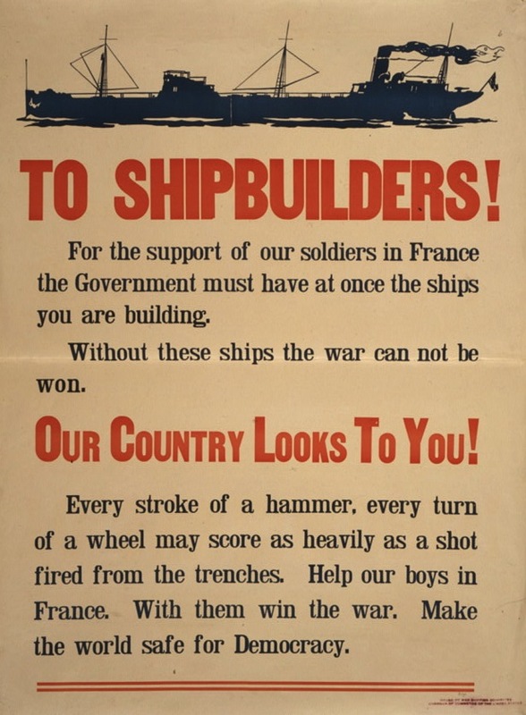 A fast turnaround time was critical; success in the war depended on it. Soon-after waging war on Germany in April of 1917, the United States had found itself ill-prepared. Americans previously relied on Europe’s merchant fleet, which now littered the ocean floor. Germany's submarine campaign threatened to compound severe shortages of food and supplies in Allied nations, and the United States needed to transport goods and troops 3,000 miles across the ocean into war zones. Military success necessitated not only the construction of new vessels for naval warfare, but the rebuilding of a depleted merchant fleet. Revitalizing America's shipbuilding industry became a top national priority.