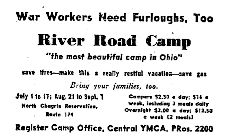 The lazy days of summer took an industrious turn for attendees of the Young Men’s Christian Association River Road Camp at the Cleveland Metropolitan Park District's North Chagrin Reservation in 1943. The camp’s forty-four temporary residents had joined in the war effort by enlisting with the United States Crop Corps service. The boys awoke at six o' clock each morning from Monday to Saturday, washed up, made their beds, and straightened the sleeping quarters for inspection. Upon devouring a large breakfast, they were piled into school buses and shipped off to local farms and orchards. The recruits spent their summer weeding, cultivating plants and harvesting crops. In return for an eight hour day of of sweat and manual labor, the youngsters received forty cents an hour and a chance to enjoy life at the YMCA’s newest camp in the Cleveland Metropolitan Parks. This wasn’t merely a chance for the boys to rough it in the wilderness under the cover of battered tents. The River Road Camp was a tiny, rustic village situated in the forested outskirts of Cleveland. The rural resort was comprised of thirty-five buildings, including a recreation center, craft shop, nature museum, dining hall, and sleeping cabins. The impressive complex housed both the mission of the YMCA and its campers — young and old alike — for nearly forty years.
