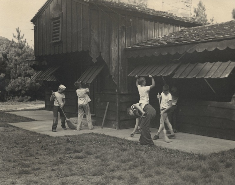 By incorporating National Park Service design standards, the cabins and campground of the American Legion Boys and Girls Camp embraced contemporary trends in camp planning. Partly a response to the theories of child psychologists of the day, professionally designed landscapes were commonly employed that envisioned encampments as planned communities. Attractive permanent structures and picturesque landscapes gained favor over tented or makeshift sites that typified campgrounds of service organizations prior to the 1930s. Dedicated in August of 1939, the ornate American Legion camp was envisioned as vacation grounds for the city’s youth. Children were to be whisked away from the stresses of daily life for a brief stint of leisure, recreation and education; the lucky campers even received a reprieve from daily chores – including the scourge of kitchen duty.