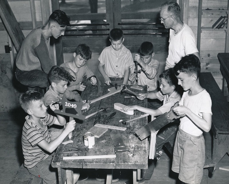 The funding, labor, and impetus to build what would become the YMCA’s River Road Camp materialized with the birth of federal relief agencies during the Great Depression. The land in North Chagrin Reservation had been operated as a camp since the 1920s by the Cleveland Heights Kiwanis Club and the Cleveland Heights Board of Education. In 1934, the Euclid Post of the American Legion took over existing camp equipment as an experiment in community service. Forty-nine additional American Legion posts agreed to support the funding and operation of the camp within a year. Even in the depths of an economic recession, their venture in the woods took root and grew. The camp brought together the varied Americanization, youth activity, child welfare, relief, community service, and juvenile delinquency programs of the American Legion. The American Legion supplied $12,000 in materials, and worked in consort with the Park Board to obtain state and Works Progress Administration support for the construction of the $100,000 camp. The immense project was meant to provide other social and civic organizations a model in offering the public both recreational and educational facilities.
