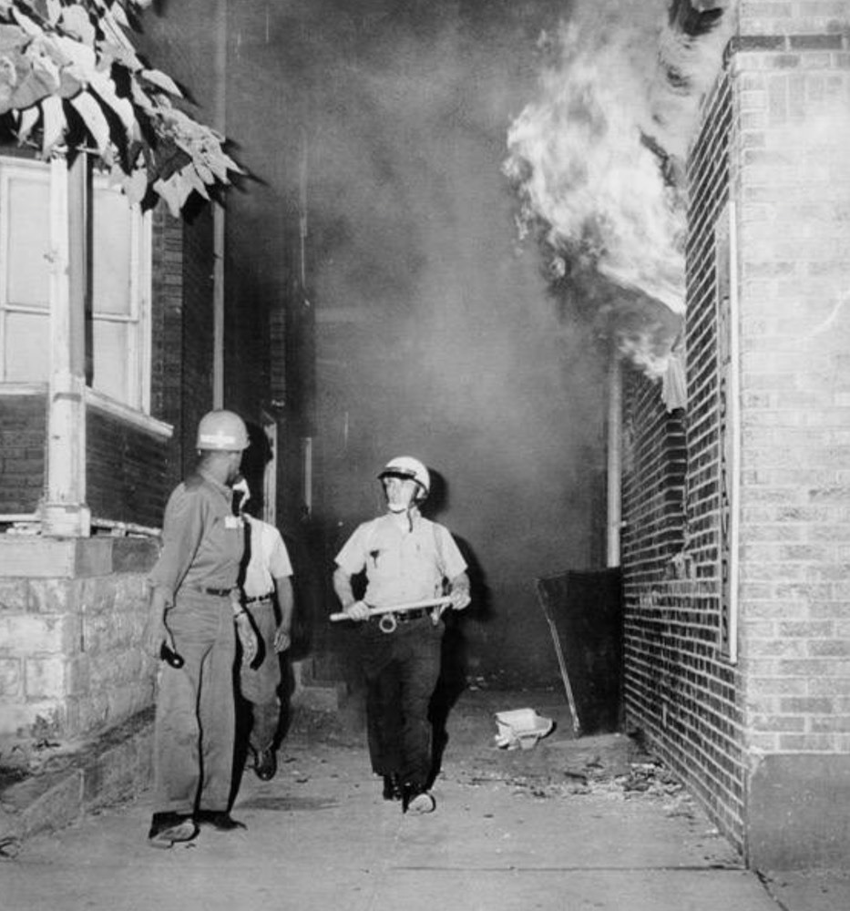 Sparked by a minor racially charged dispute at a neighborhood bar at East 79th Street and Hough Avenue, the July uprising in Hough brought widespread looting, arson and destruction. While impacting the entire community, primary targets were white-owned stores, abandoned buildings, and residences owned by absentee landlords. As symbols of civic authority, police officers and firemen were met with violence; no white civilians were attacked. Conversely, an African American was fatally shot by a patrol of white vigilantes while driving to work. Three additional Black residents of Hough were also killed by unknown assailants during the week.