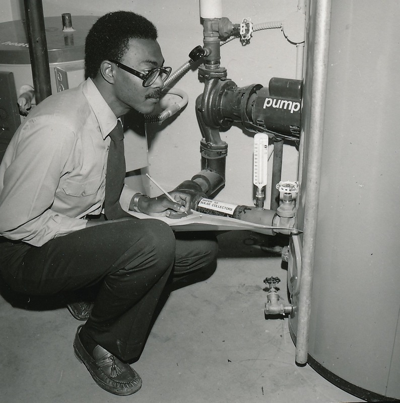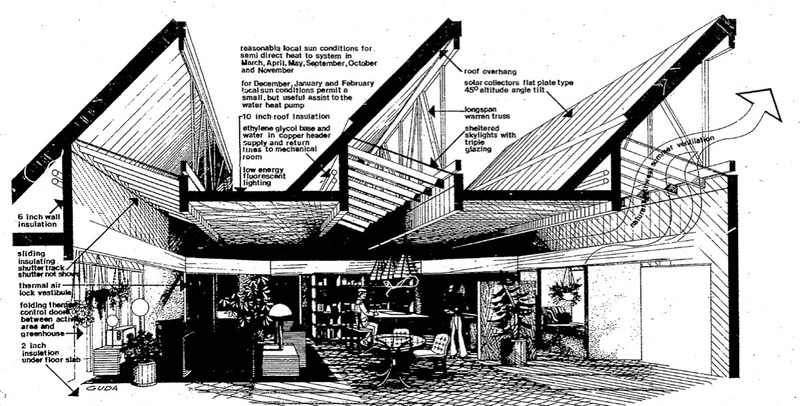 The Solar Energy House The energy efficient home displayed at the 1976 Home and Flower Show was designed by Neil William Guda. Solar collectors on three sections of the roof provided heat for the home. As the sun heated water circulating in tubes under the plastic surface of the solar panel, the warm water flowed to a heat storage tank in the adjoining greenhouse. Source: The Cleveland Plain Dealer