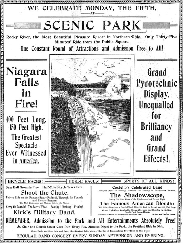 In the spring of 1903, the management of Scenic Amusement Park hired surveyors to study possibilities for overcoming the watery divide separating Lakewood and Rocky River. A scheme had been concocted to unite the two suburbs. On the land that now comprises Cleveland Metroparks Scenic Park, surveyors formulated plans for a multichannel chute to span the width of the Rocky River. Even though Scenic Park was the leading amusement park west of Cleveland, it was feared that the resort’s continued profitability hung in the balance of completing construction of the newest attraction. Park management, however, had no intention of erecting a new stomach-dropping toboggan ride; one passage in the chute would transport boxes of cash to Rocky River, while the neighboring duct accommodated a dumbwaiter large enough to convey glasses of beer and liquor to Scenic Park's German Village in Lakewood. Far from being the most exotic diversion, it was assured to become a favorite park-destination for Cleveland’s working class.