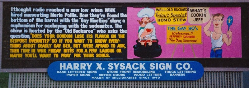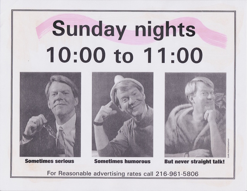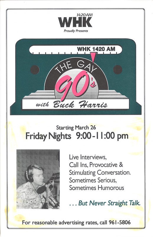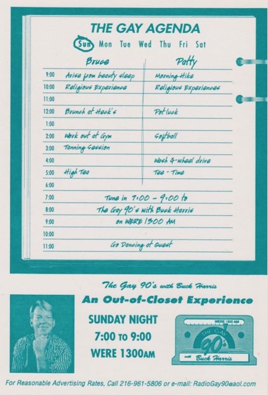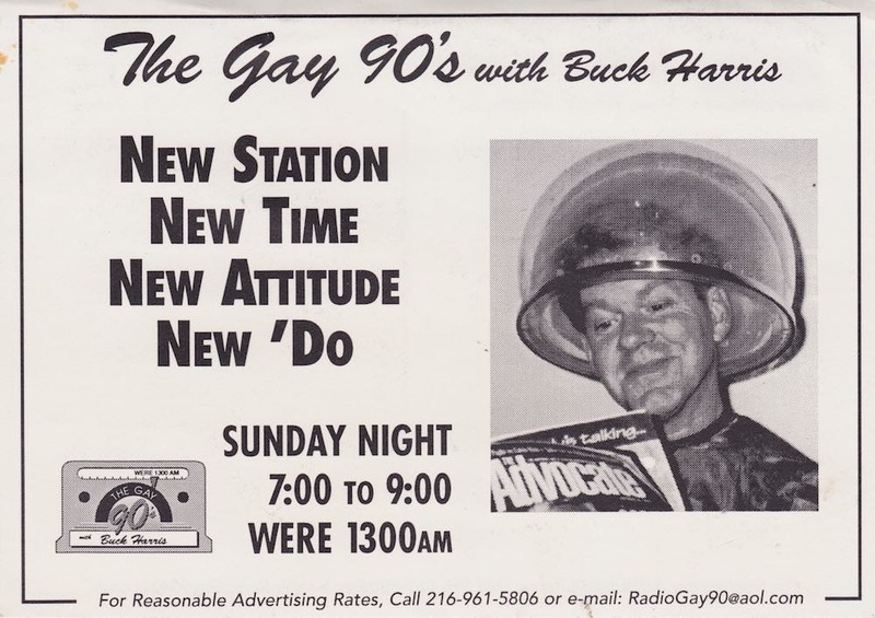After two and a half years broadcasting from WHK on Friday nights and getting preempted for sports broadcasting on more than one occasion, Harris moved to another station, WERE 1300 AM. From there, The Gay 90s aired on Sunday evenings – a time slot Harris preferred, believing that his target audience was more likely to be home (and tuned in), not partying in one of Cleveland’s many gay bars. Harris once commented, “Our entrée into the gay community was through the doors of gay bars”. Not that he was opposed to gay bars – after all, he was a former bartender at the locally famous gay bar, Twiggy’s, and knew the bar’s value as a community anchor. But Harris also knew Cleveland’s gay community needed an alternative to the bar scene, and needed, literally, a voice. Seeing the opportunity and the need, Harris offered his voice as he opened the every show with this greeting: “Good evening Cleveland… Welcome to The Gay 90s, the voice of Northeast Ohio’s gay and lesbian community. It is the intent of this show to provide programming that represents the diversity of our gay and lesbian community and reveal the deep cultural and historical contributions that for too long have gone unrecognized. The opinions expressed are those of the host and guest and not necessarily of WERE or its management – as a matter of fact, probably not. If you are a member of our community, a friend, or just a curious listener we certainly welcome you and please give us a call this evening at 578-1300. If you’re not a friend, don’t tune in, don’t call and find some other way to torture yourself. And a word about our advertisers: unless otherwise stated, you can assume their sexual orientation to be either bi or gay or straight.“