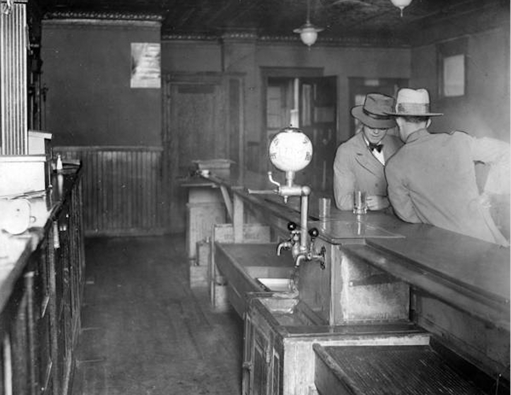 Plotting something? Two men chat inside an empty bar on Waterloo Avenue during Prohibition. Note the decorative Schlather's Rock beer display on the draught system.  Source: Cleveland Press Collection, Department of Special Collections, Cleveland State University