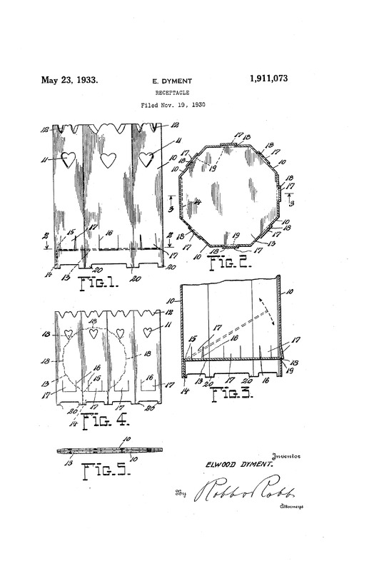 Dyment Patent drawing Another of Elwood Dyment's many ideas for pressed-paper, this is his patent drawing detailing the plans of a collapsible trash receptacle which was eventually produced at his Cleveland facility. Source: U.S. Patent Office Date: 1933