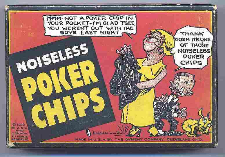 Dyment's Noiseless Poker Chips Elwood Dyment had many ingenious ideas involving pressed-paper products, which his Cleveland firm specialized in. These chips featured cartoons similar to the one on their storage box. Although they were clearly meant to be humorous, they would be considered decidedly off-color today. Source: www.antiquegamblingchips.com Creator: Robert Eisenstadt