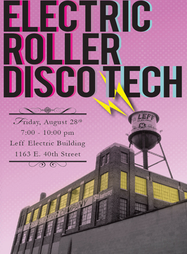 2009 advertisement for an unusual event to spark interest in the under-utilized building Towards the end of Leff Electric's occupation of the building on East 40th Street, and just a year before it was transformed into Ariel International, The St. Clair-Superior Development Corporation sponsored an event inside the, then largely vacant, building that featured local art, DJs, dancing and roller skating. Note the iconic water tower being emphasized with lightening bolts on the top of the building. It has featured in the work of many local artists and photographers. Source: St Clair/Superior Development Corporation Date: 2009
