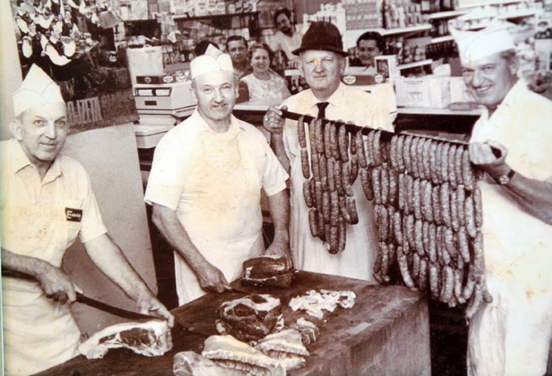 The Azman Family. In this undated photograph, two generations of Azman men gather around the butcher block table still in use in the shop today. Directly behind the group shows how the shop appeared when it once served as a neighborhood grocery providing canned goods, produce, and pantry items in addition to the Azman Slovenian smoked sausages. Source: Frank Azman