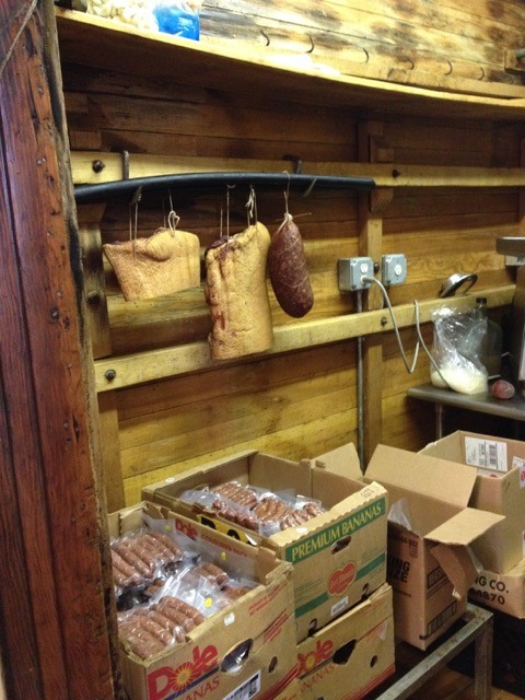 Inside the Meat Cooler. Inside the wood construction freezer hangs meats waiting to be processed and sausages ready for purchase just as they have since the market opened in 1924. Source: Joe Dill