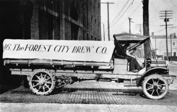 An early truck from Forest City Brewing Co This delivery truck waits to be loaded outside the front gates of the Forest City Brewing Company on Quincy Ave in 1915. This would be during a period of enormous growth and innovation at the plant that Prohibition would bring to an end just 4 years later. Source: www.whatwasthere.com Creator: John Murray Date: 1915