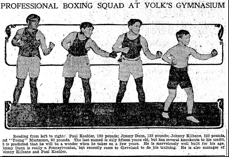 As young school boys who trained at the La Salle Club grew older, other, more professional places were needed to provide continued training in the sport of boxing. Johnny Kilbane, and others like Tommy Kilbane (no relation), Tommy (later "Black Jack") McGinty, and "Young Brick" Masterson, at first often had to travel out of the Old Angle neighborhood to places like Volk's Gymnasium downtown on Prospect Avenue to train. But in 1910, that changed when Jimmy Dunn, legendary trainer of Johnny Kilbane and other early twentieth century fighters, opened his first professional gym in the Angle neighborhood at 2618 Detroit Avenue--just a block west of the intersection of West 25th Street and Detroit. According to an article which appeared that year in the Plain Dealer, Dunn's new establishment was "fitted up as completely as any gym in the city." Johnny Kilbane was training out of Dunn's Gym at 2618 Detroit when he won his featherweight boxing crown in 1912.