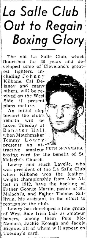Boxing in the Old Angle, an historic Irish neighborhood located on Cleveland's near west side, has deep roots, reaching back at least as far as the year 1894 when Brother Salpicious of the Christian Brothers of the La Salle Order founded the La Salle Literary and Athletic Club at St. Malachi school for boys on the corner of Pearl Street (West 25th) and Division Avenue. The Club encouraged boys attending St. Malachi to engage in a number of sports, including boxing. It achieved national attention in 1912 when it sponsored the St. Patrick's Day parade in Cleveland, featuring new featherweight boxing champion Johnny Kilbane, who had learned to box at the La Salle Club in the first decade of the twentieth century.