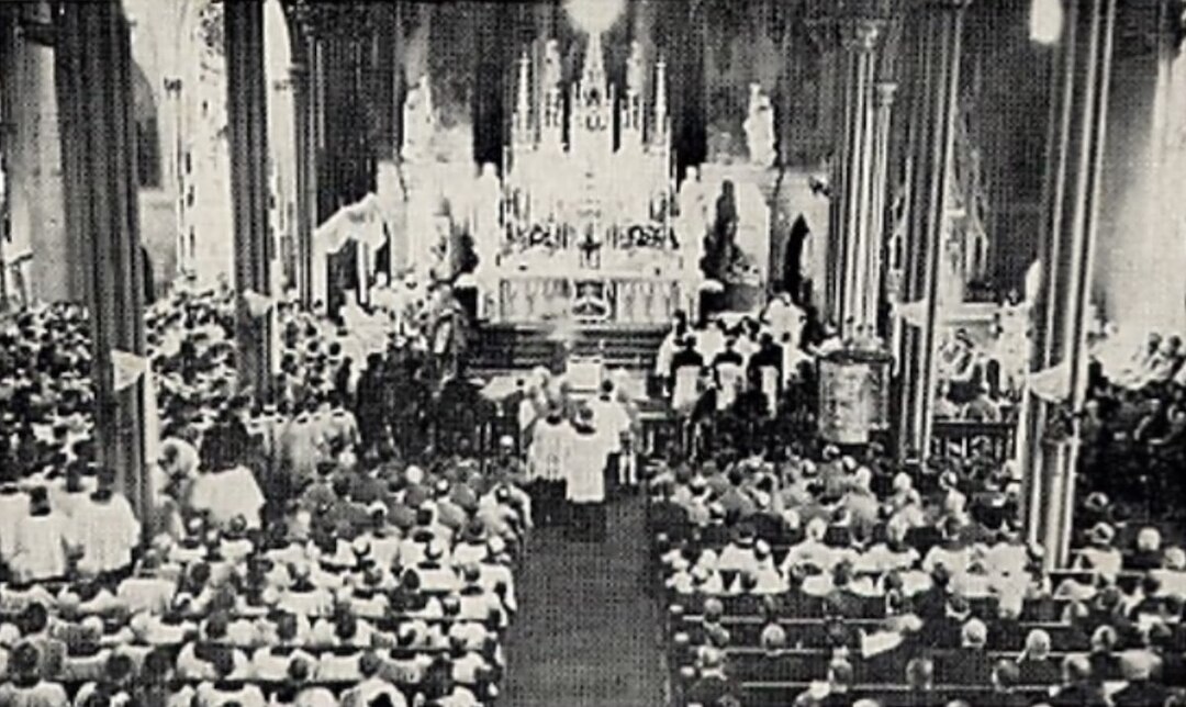 Cleveland and St. John Cathedral hosted the Seventh National Eucharistic Congress in 1935. The Catholic 'convention' featured meetings and seminars over several days in addition to worship services. The crowd pictured here assembled for Cardinal Hayes's reception. A parade also featured Alfred E. Smith, New York's governor and the first Catholic nominee for president of the United States. Source: Cleveland Memory Project, Cleveland State University Library Special Collections Date: 1935