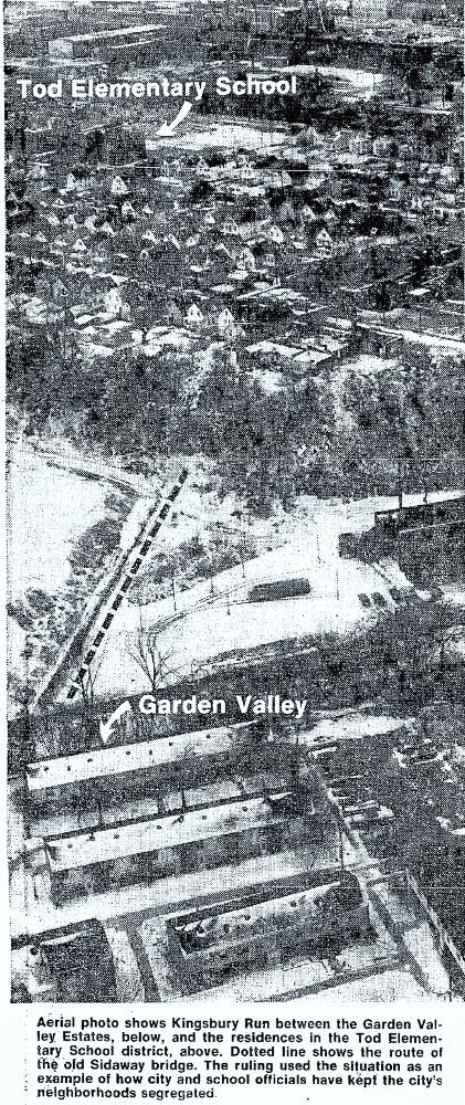 Notoriety did not depart from this area of Cleveland even when the Kingsbury Run murders came to an end. In the next three decades, a new type of notoriety for the two neighborhoods arrived, when the Kinsman Road neighborhood transitioned from one that had been largely white and ethnic to one that was largely African-American. Portions of that latter neighborhood had severely deteriorated housing and, in the years 1955-1959, under a federal urban renewal program, 130 acres, between East 71st and East 79th Streets, was cleared of that housing and the 650-unit Garden Valley subsidized housing project built. An increased number of African-American children began using the Sidaway Bridge to walk to Tod Elementary School, the public school in the still largely white and ethnic Jackowo neighborhood. And now the Sidaway Bridge connected a black and a white community in a city where, in the early 1960s, racial tension was mounting.