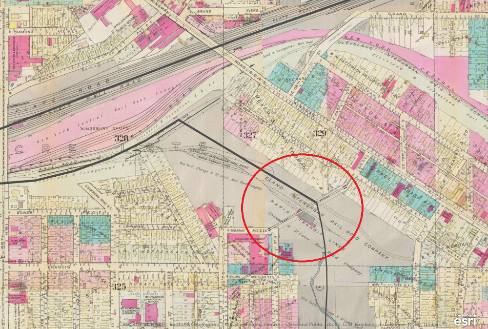 That bridge — initially called the Tod-Kinsman Bridge, but, within a year of its opening renamed the Sidaway Bridge after the new approach road that had been created during its construction — served that purpose for more than twenty years, and as well provided a convenient shortcut for folks on the north side of the Kingsbury Run to walk to Dahler's, a popular beer garden in the Jackowo neighborhood. In the late 1920s, however, the bridge's braced wooden framework became an obstruction for the Nickel Plate Railroad, now owned by the Van Sweringen Brothers, who desired to build several car barns at this location in Kingsbury Run for their Shaker Heights rapid transit line. The city and the railroad agreed that the trestle bridge would come down and that the railroad would bear the cost of replacing it with a new bridge, one that would allow for continued pedestrian travel between the Jackowo and Kinsman Road neighborhoods, while at the same time creating open space below for the new rapid transit buildings.