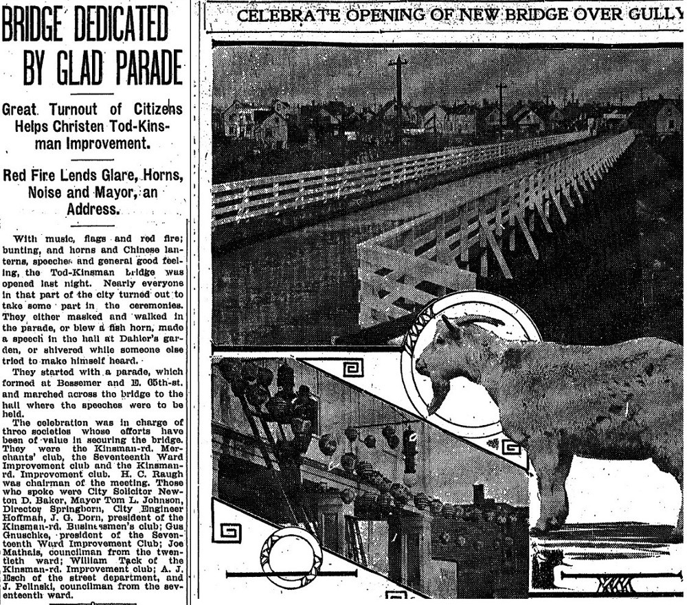 It was not the first Sidaway Bridge. That one — the longest wooden bridge in Cleveland history — was a massive trestle bridge that stretched 675 feet across and 80 feet above the Kingsbury Run, connecting the Jackowo Polish neighborhood on the south side with the then largely Hungarian Kinsman Road neighborhood on the north. It was built as a pedestrian or "foot" bridge in 1909 by the Tom Johnson administration at the urging of three citizen groups from the two neighborhoods who believed, according to a Plain Dealer editorial at the time, that connecting the two communities–then largely white and ethnic–with a bridge would contribute to their mutual commercial and general welfare.