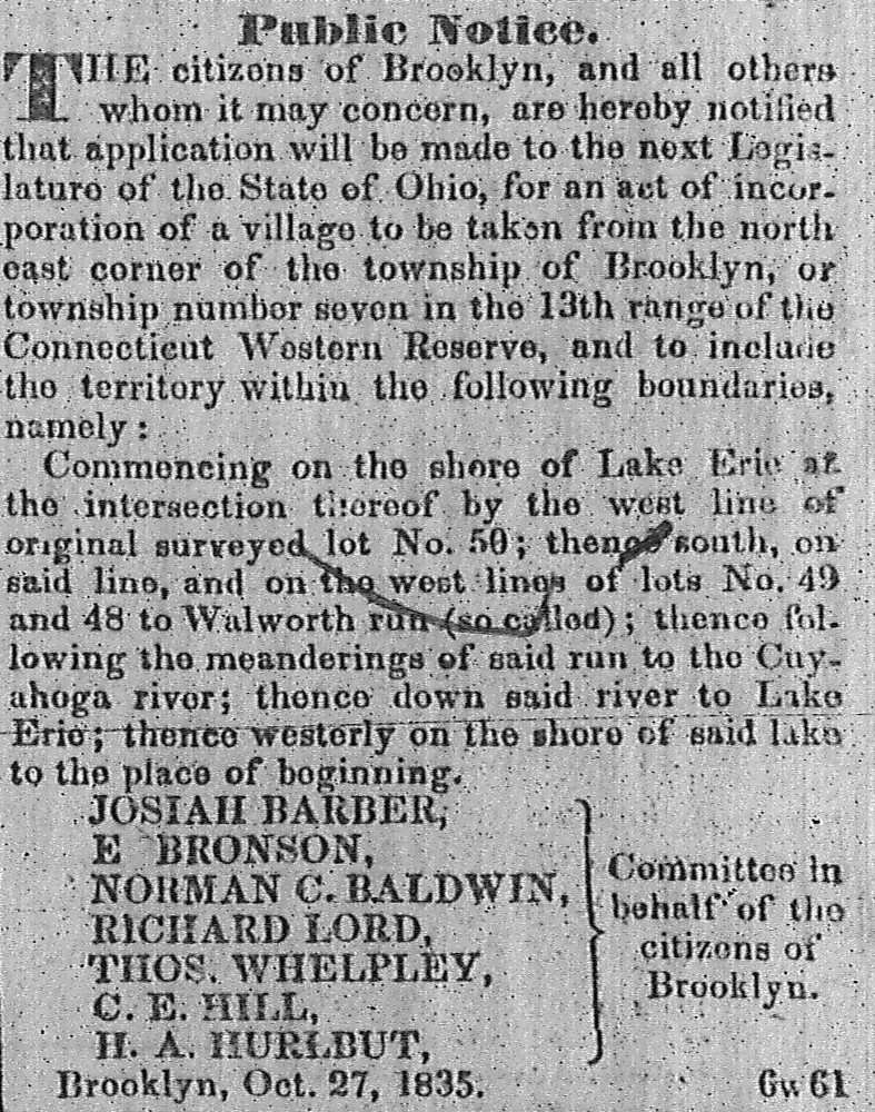 The first village lots were sold in 1820 and the village soon became known as Brooklyn. In the same year that village development on the west bank began, Barber and Noble Merwin, who owned land across the river, obtained a license from the Ohio Legislature to build a permanent bridge across the Cuyahoga River. However, the demand for village lots in the 1820s turned out to be not sufficient to justify the expense of building that bridge, and the two men, probably wisely, allowed their license to expire. In the decade that followed, that would all change.