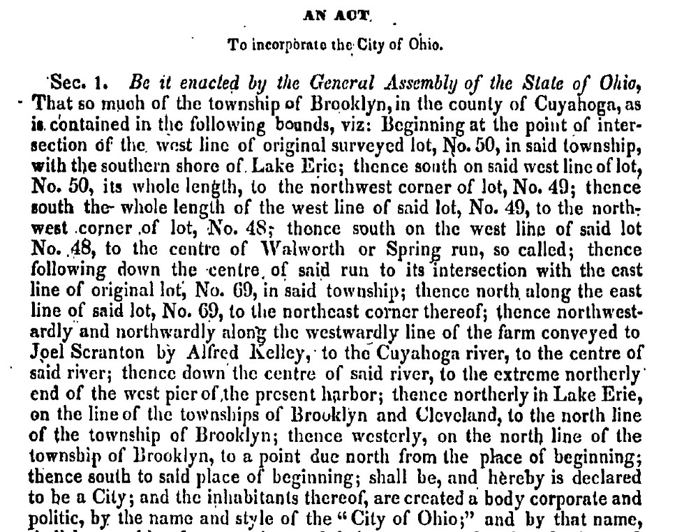 In the end, separate charters were sought for each side of the river. On March 3, 1836, Ohio City, officially known as the City of Ohio, came into existence. Notable in its charter was the new western boundary line set along the western line of original Brooklyn Township Lot No. 50, which today would be between West 58th and West 59th Streets.