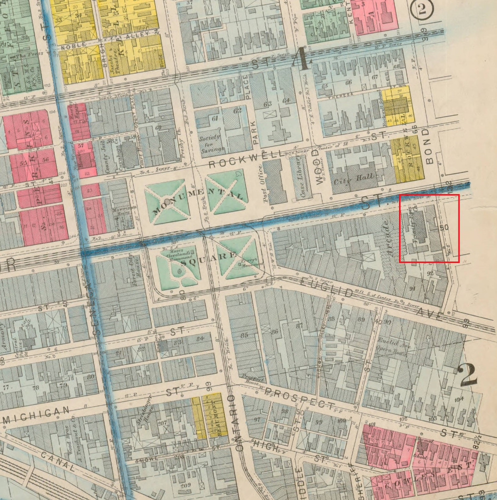 1892 Map of Downtown Cleveland The intersection of Bond (East Sixth) Street and Superior Avenue is identified by the red square drawn on the map. In this year, Trinity Cathedral and the mansion of Samuel Raymond occupied the site of the present-day Leader Building. Creator: Cleveland Public Library, Digital Map Collection