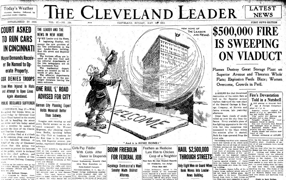 New Home of the Leader and News So proclaimed the Cleveland Leader on May 18, 1913, the day that it and the Cleveland News moved into the new Leader-News Building on the corner of Superior Avenue and East Sixth Street. The Leader would only be around for another four years, but the Cleveland News remained a tenant in the building until 1926 when it moved to a new location at Superior Avenue and East 18th Street. (The News was purchased in 1932 by the parent company of the Cleveland Plain Dealer and it continued to be published in Cleveland until 1960.) After the News moved out of the Leader Building, the building quickly became better known as an office building for lawyers than as the former publishing site of two of Cleveland's historic daily newspapers. Source: Cleveland Public Library, Newspaper Microfilm Collection