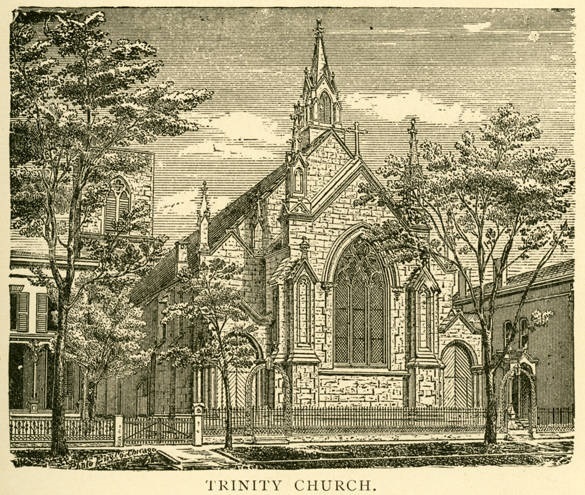 Trinity Church The first Episcopal parish on the east side of the Cuyahoga River, it was founded in 1826. Its first church was located on St. Clair Avenue. In 1854, the parish moved into a new church on the south side of Superior Avenue near Bond (East Sixth) Street. While on this site, Trinity Church became Trinity Cathedral when in 1875 the Ohio Episcopal Diocese was formed and headquartered in Cleveland. The church remained on this site for more than fifty years, before the parish and diocese relocated to Euclid's Millionaires' Row in the last decade of the nineteenth century. The Superior Avenue property was sold in 1902 and the church (shown in this 1876 wood cut print) torn down in 1904. The site is now occupied by the Leader Building. Creator: Cleveland State University, Michael Schwartz Library, Special Collections
