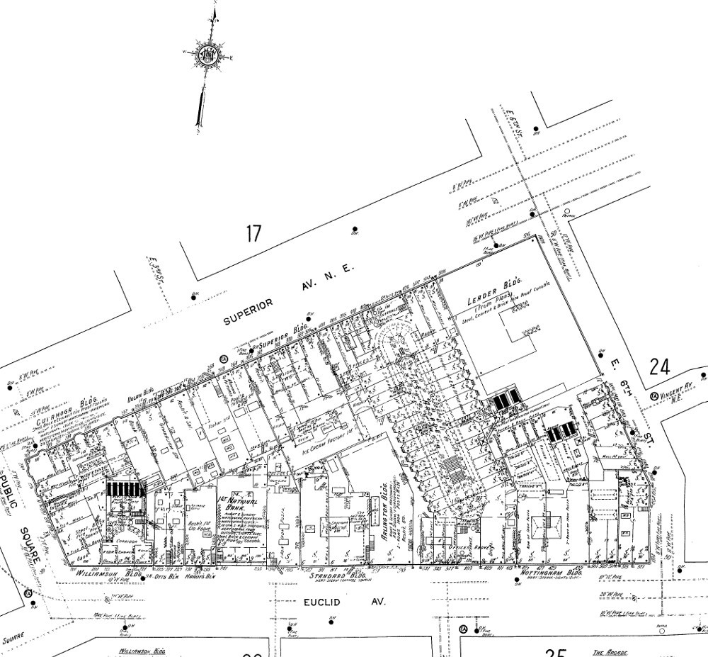 Leader Building Footprint This portion of the 1912 Sanborn Insurance Map of downtown Cleveland shows the proposed location for the new 14-story Leader Building on the southwest corner of Superior Avenue and East Sixth Street. Actually, by 1912, the building was already going up and was completed in 1913. Source: Cleveland Public Library, Digital Map Collection