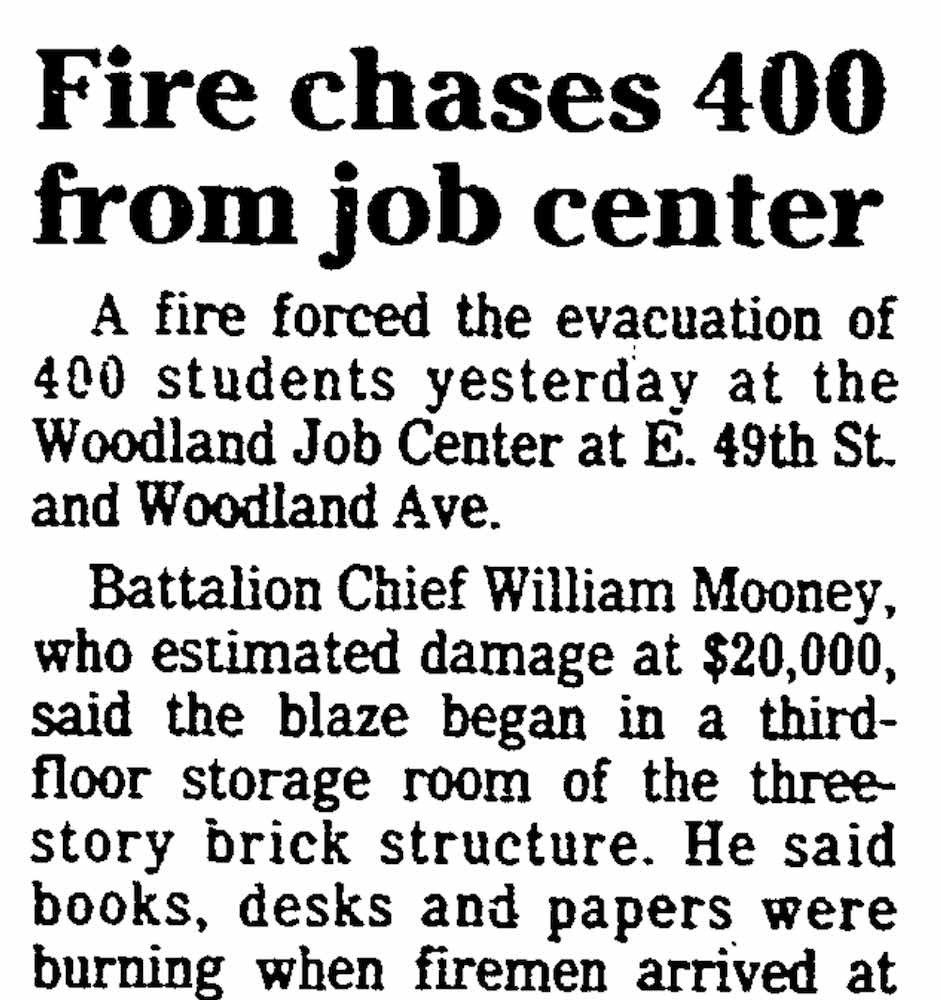 Rumors that Cuyahoga Community College might buy the Woodland Job Training Center left many people hopeful for the future. For community members, the idea of losing the job training and employment opportunities would mean dire consequences for those the center served. Without the ability to get skills training and education, the hard-core unemployed of the Gladstone area would be left with no real option but to turn to criminal activity or dependence on the welfare system to survive. On May 29, 1985, however, any thought of saving the center evaporated when a fire broke out in a third-floor broom closet. The fire department estimated damages at $20,000 and determined the cause of the fire to be arson.