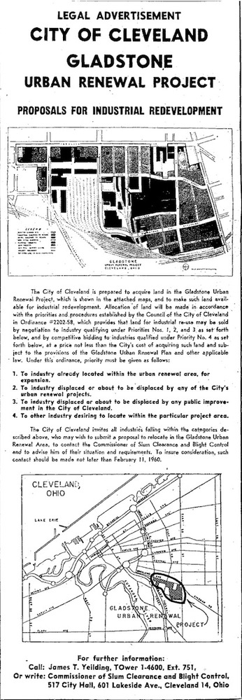 Gladstone, which ran from East 37th to East 55th streets between Woodland Avenue and the Nickel Plate Road rail yard, was often described as the “worst slum” in the city. As such, Cleveland designated Gladstone as an area for urban renewal and sought to revitalize the neighborhood without federal funding. In the late 1950s, however, efforts to convert the neighborhood to light industry stalled as the city of Cleveland found the cost of buying and clearing the land too expansive. In 1968, as federal funding rolled in to aid the development process, Mayor Carl Stokes remained committed to turning the vacant land in the Gladstone neighborhood into a viable place for light industry. Given the mandate from President Johnson to combat poverty where it lived, and Briggs’s commitment to quality education, the Gladstone neighborhood represented the perfect place for a job training center.