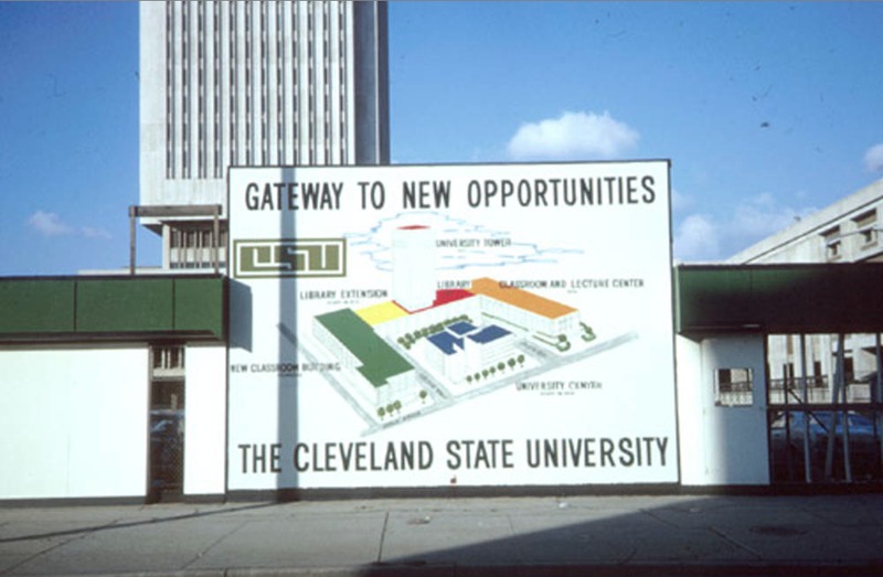 Campus Plan, 1971 Signs such as these are familiar to Cleveland State students and alumni, as well as travellers along Euclid Avenue. The university has had several major campus development plans intended to correct the core of the original design, in which the campus was elevated, self-contained, and inward facing. Source: Cleveland Memory, Cleveland State University Library Special Collections Date: 1971