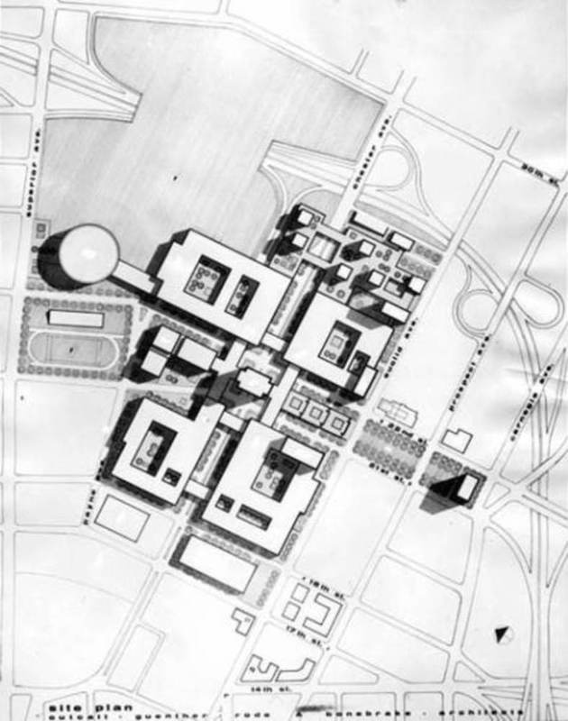 Site Plan, 1965 The original site plan prepared for Cleveland State University envisioned leveraging federal urban renewal funds (which never materialized) to build a compact 65-acre downtown campus. Like the Erieview urban renewal plan created five years before, the CSU plan was a modernistic compound of interconnected three-story classroom buildings and plazas punctuated by several high-rise office buildings. It was to include parking garages "under almost the entire campus--enough for 8,000 autos," according to the text that accompanied this rendering. "In this way," the plan exuded, "a complete walk-and-talk campus is built above the city streets." Although the university never reached the projected 35-40,000 students, over time it came to resemble the plan to the extent that some observers quipped that CSU stood for "Concrete State University." Today's 17,000 students enjoy the fruits of more recent efforts to craft a campus where glass and green space soften CSU's once-fortress-like presence. Source: Cleveland Memory, Cleveland State University Library Special Collections Date: 1965