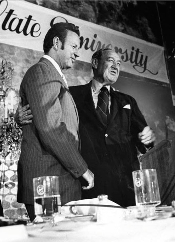 Going Away Luncheon For Harold Enarson, 1972 Enarson, pictured on the left with CSU's first Board of Trustees chairman James Nance, was the university's first president. Enarson left CSU to become president of Ohio State, famously firing legendary football coach Woody Hayes following an on-field altercation with a Clemson player in 1978. Source: Cleveland Memory, Cleveland State University Library Special Collections Date: 1972