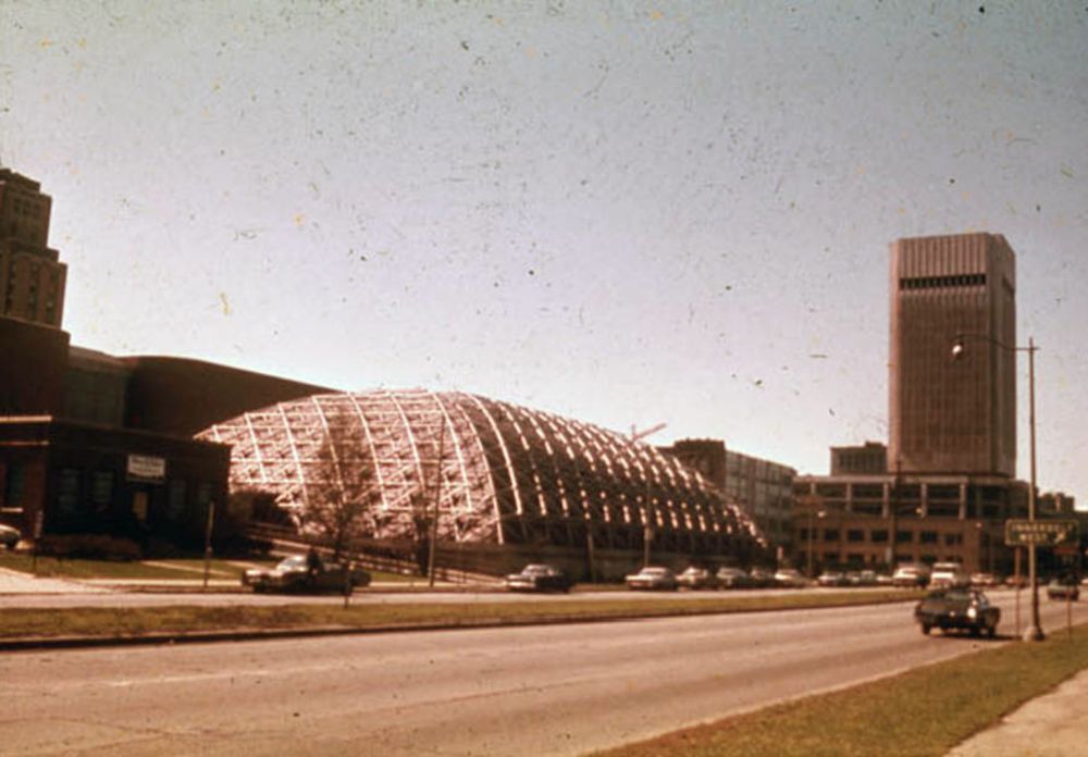 Intramural Sports Center, 1985 Opening in 1972, "The Intramural Sports Center was a geodesic dome designed by Thomas T. K. Zung. A heavy snowstorm during construction in January 1971 caused the roof to sag, requiring the construction of a second exoskeleton of aluminum pipes and horizontal purlins. The dome contained two basketball courts, a training room, a combative area, dressing rooms, laundry, and offices. The building was razed in 2005 for construction of the Student Recreation Center." -Accompanying archival description. Source: Cleveland Memory, Cleveland State University Library Special Collections Date: 1985