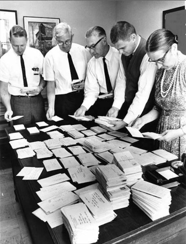 The Press Nickname Contest, 1965 In order to decide CSU's nickname, the Cleveland Press held a contest asking readers for submissions. The photo shows the selection committee at CSU sifting through the thousands of entries that were received. Six finalists were chosen and voted on by the student body with The Press awarding a $500 scholarship to the winner. Viktorious Vike was named the first mascot, succeeded by the comic strip character Hägar the Horrible. Later Vike assumed the role, and in 2007 CSU introduced its current mascot, Magnus. Source: Cleveland Memory, Cleveland State University Library Special Collections Date: 1965