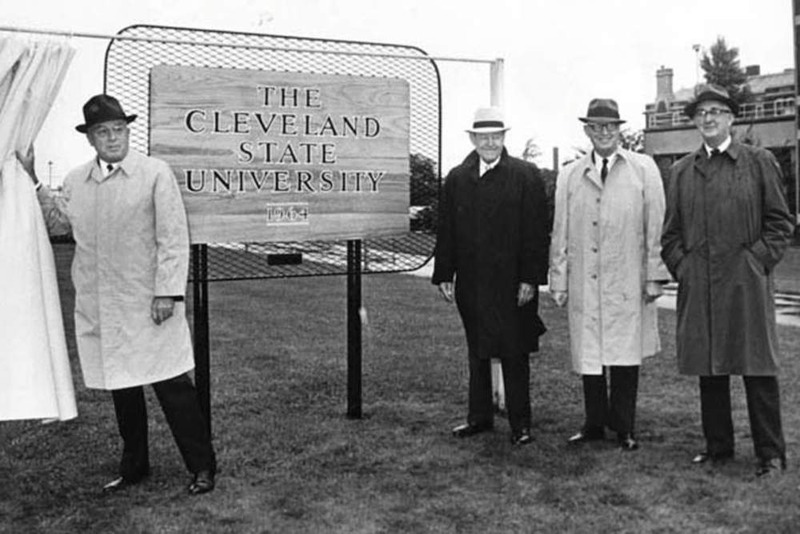 Sign Unveiling, September 1, 1965 Harry F. Burmester ceremoniously pulled aside a curtain concealing a modest wooden sign and with this act official operations at Cleveland State began. Source: Cleveland Memory, Cleveland State University Library Special Collections Date: September, 1, 1965