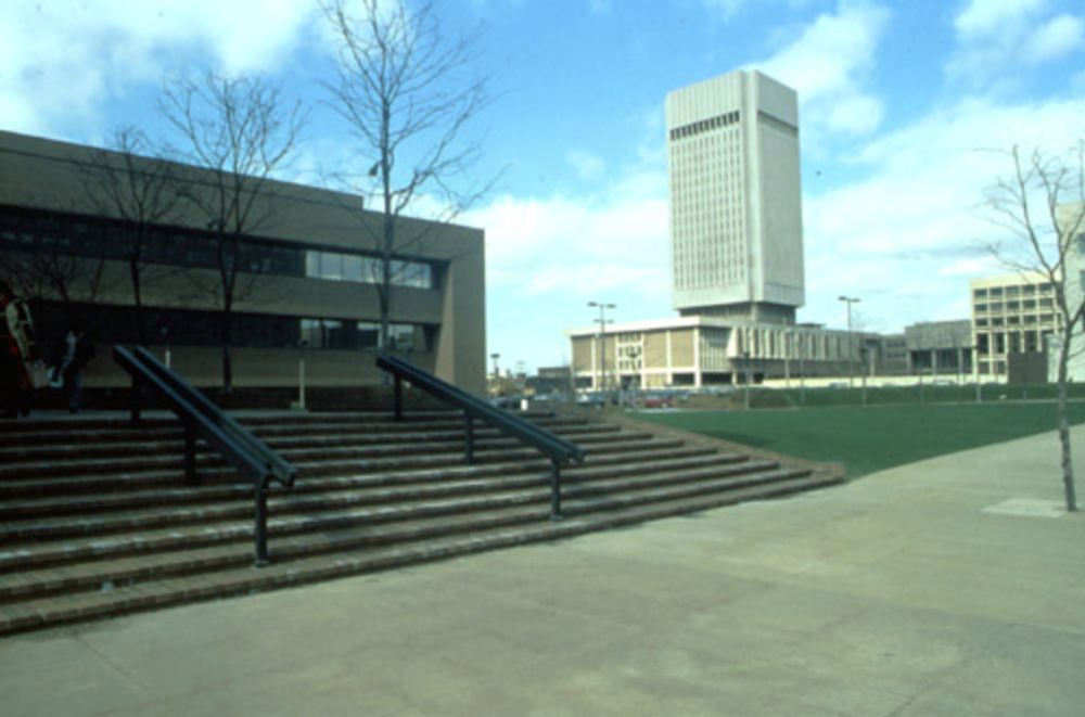 University Tower Construction, 1969 Exhibiting the Brutalist design style that characterized CSU's early buildings, the 20-story structure looms over much older office buildings and tenements on now-defunct East 19th and 20th streets (now home to the Music and Communication Building). The tower was renamed Rhodes Tower in 1981, prompting The Plain Dealer to ask, "Does this mean all who study there will be Rhodes scholars?" Now emblazoned with green CSU logos, Rhodes Tower has become an icon for the university and a visible part of Cleveland's skyline. Source: Cleveland Memory, Cleveland State University Library Special Collections Date: 1969