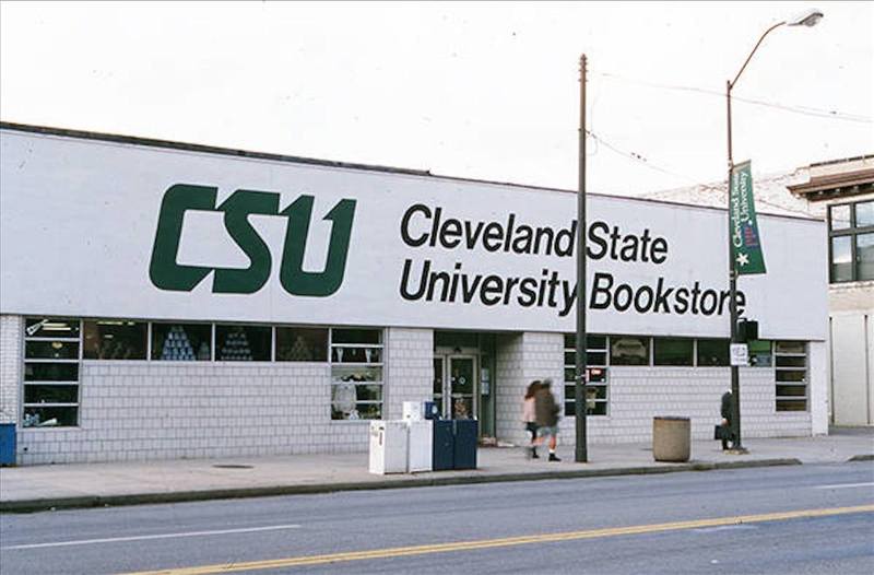 Cleveland State University Bookstore, ca. 1990 Formerly occupied by the Bell Motors Co., CSU's first bookstore was located on the south side of Euclid Avenue across from Fenn Tower and East 24th Street. The store remained in that location from 1966 to 2010 when it was moved to the new Student Center. The old building was torn down to make way for the Euclid Commons student housing development. Source: Cleveland Memory, Cleveland State University Library Special Collections Date: 1990