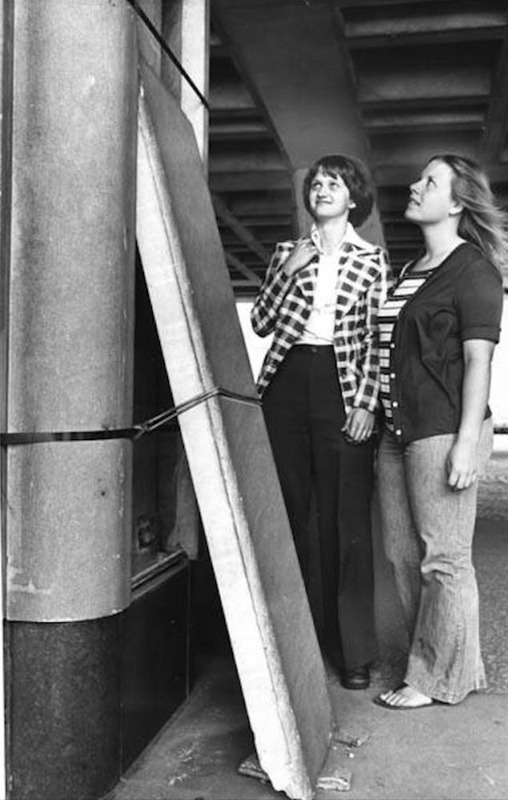 Main Classroom, 1976 Two students examine a slab of stone that has fallen from a pillar under Main Classroom. Structural issues of this sort have been something the university has been forced to address throughout its history, most notably the discovery that University Tower was sinking shortly after its completion. The tower descended nearly twelve inches before finally settling. Source: Cleveland Memory, Cleveland State University Library Special Collections