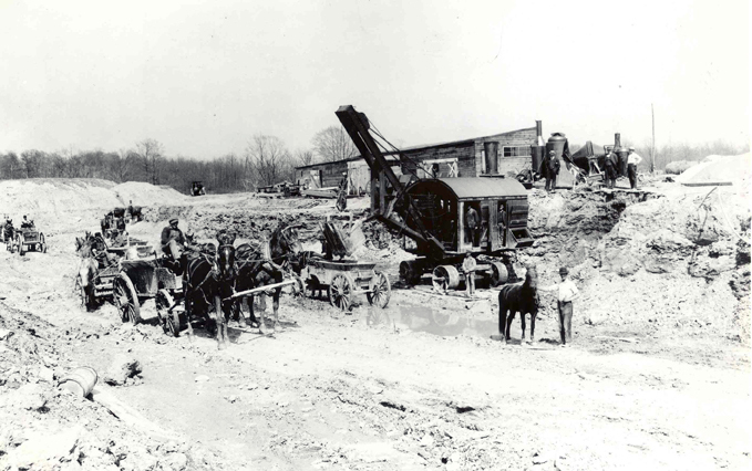 Construction Begins on Nela Park, 1913 Horse-drawn wagons and a steam shovel assist in work on what would soon become one of East Cleveland's leading employers. Source: Cleveland State University Library Special Collections