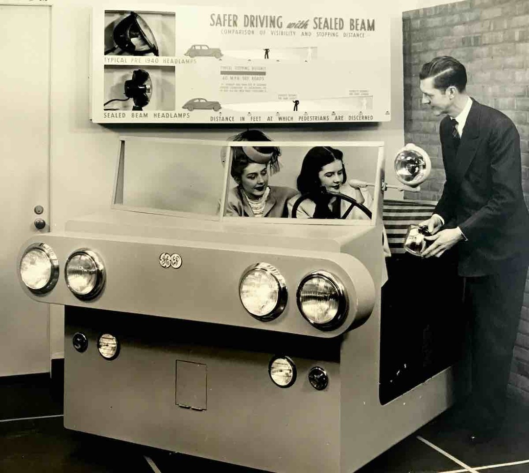 Sealed Beam lamp promotion George E. Meese and two models (names unknown) promote new Sealed Beam lamps at Nela Park's Lighting Institute. Val Roper and his team of engineers invented the 7" Sealed Beam headlight system in 1936-37. The innovation probably saved many lives by protecting against nighttime auto accidents. Meese, who was on Roper's team in the 1930s, also headed the team that developed SniperScope, the first operational night vision system, which was deployed for the first time in 1945 in the Pacific theater of World War II. Meese also went on to invent the four-headlamp high/low 5-3/4" headlight system in 1958, setting the new industry standard for headlights that reduced glare during normal operation. Source: George P. E. Meese, Ph.D. Creator: Parade Studios, Inc., 1375 Euclid Ave., Cleveland 15 Ohio Date: ca. 1948-54