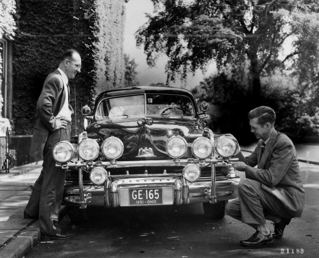 Many-eyed Vehicle, 1951 Val J. Roper (left) and George E. Meese (right) inspect this novel automotive use of GE headlamp prototypes on a 1951 Lincoln to conduct road tests under a range of conditions. Direct field tests were the final step in testing products developed in a lab on the NELA campus. Meese worked at NELA Park from 1930 to 1971 and often drove test cars such as this one to show to Detroit carmakers or state regulatory agencies. Source: Cleveland State University Library Special Collections