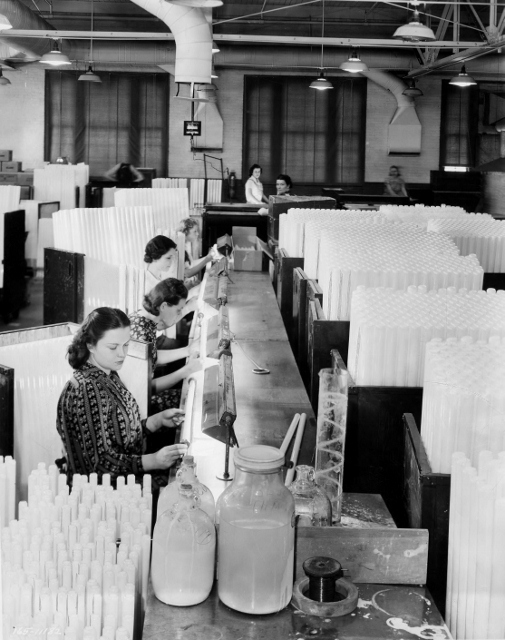 Fluorescent Lamps, 1940 Six years after its first successful test of fluorescent lighting, Nela Park was beginning to produce the lamps in growing quantities, a trend that would accelerate during World War II. In this photo, women test newly manufactured bulbs. Source: Cleveland State University Library Special Collections